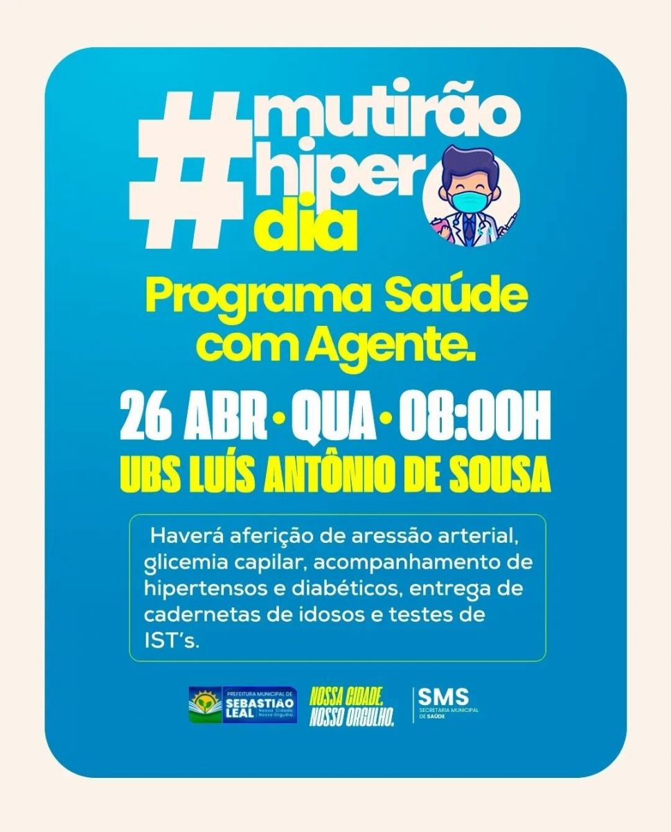 No dia 26/04/2023, a Secretaria Municipal de Saúde de Sebastião promoverá um multirão na UBS Luís Antônio de Sousa a partir das 8:00 horas. Teremos aferição de pressão arterial, glicemia capilar, acompanhamento de hipertensos e diabéticos, entrega de cadernetas para idosos e testes de ISTs.