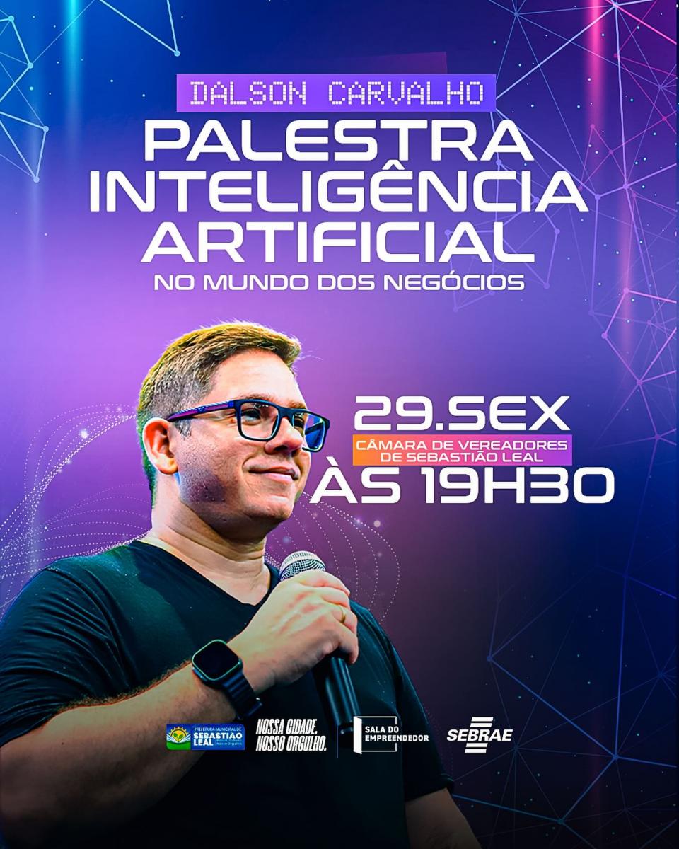A palestra “Inteligência Artificial no Mundo dos Negócios”, com Dalson Carvalho, será nesta sexta-feira, 29, às 19h30, na Câmara dos Vereadores de Sebastião Leal. Venha explorar como a IA está revolucionando o mercado e impulsionando oportunidades! #Inovação #IA #Negócios