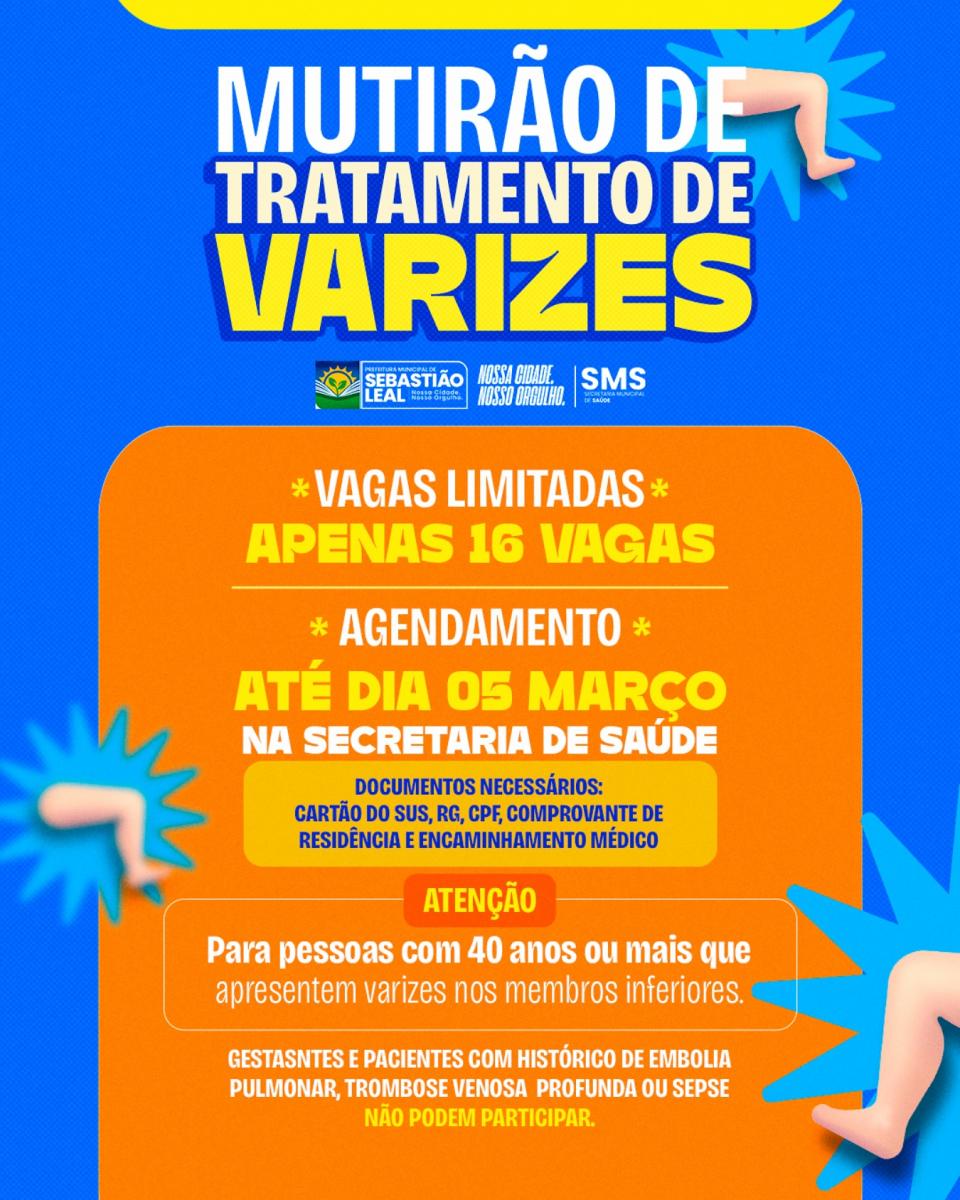 A Secretária de Saúde destaca que o mutirão é uma oportunidade para os pacientes que sofrem com varizes receberem tratamento especializado e de qualidade . A ação é mais uma iniciativa da Secretária de Saúde em parceria com a Prefeitura de Sebastião Leal.